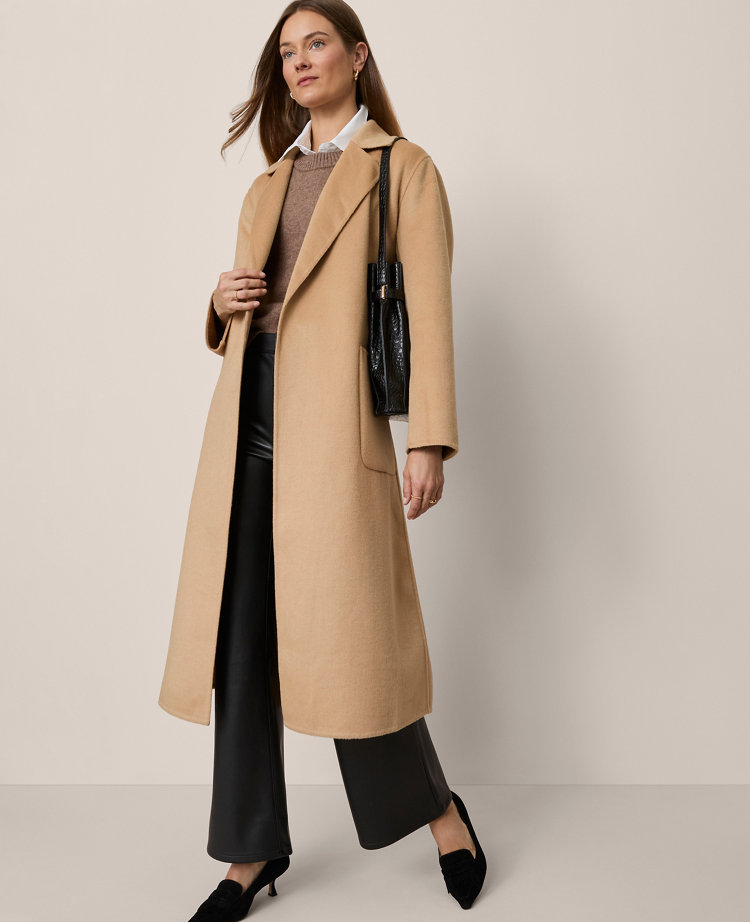 Our timeless coat features a tailored silhouette and distinctive notch collar. Stand collar. Long sleeves . Double breasted front. Self-tie belt. Front patch pockets. Back vent.
