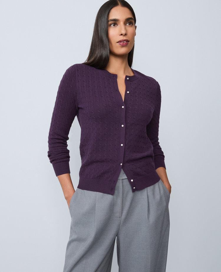 Meet your instant wardrobe icon, the Ann Cardigan. Tailored in a mix of cable and pointelle stitches, our signature favorite comes in an array of rich colors and patterns. Ribbed round neck, cuffs and hem. Front-button closures. Long sleeves.