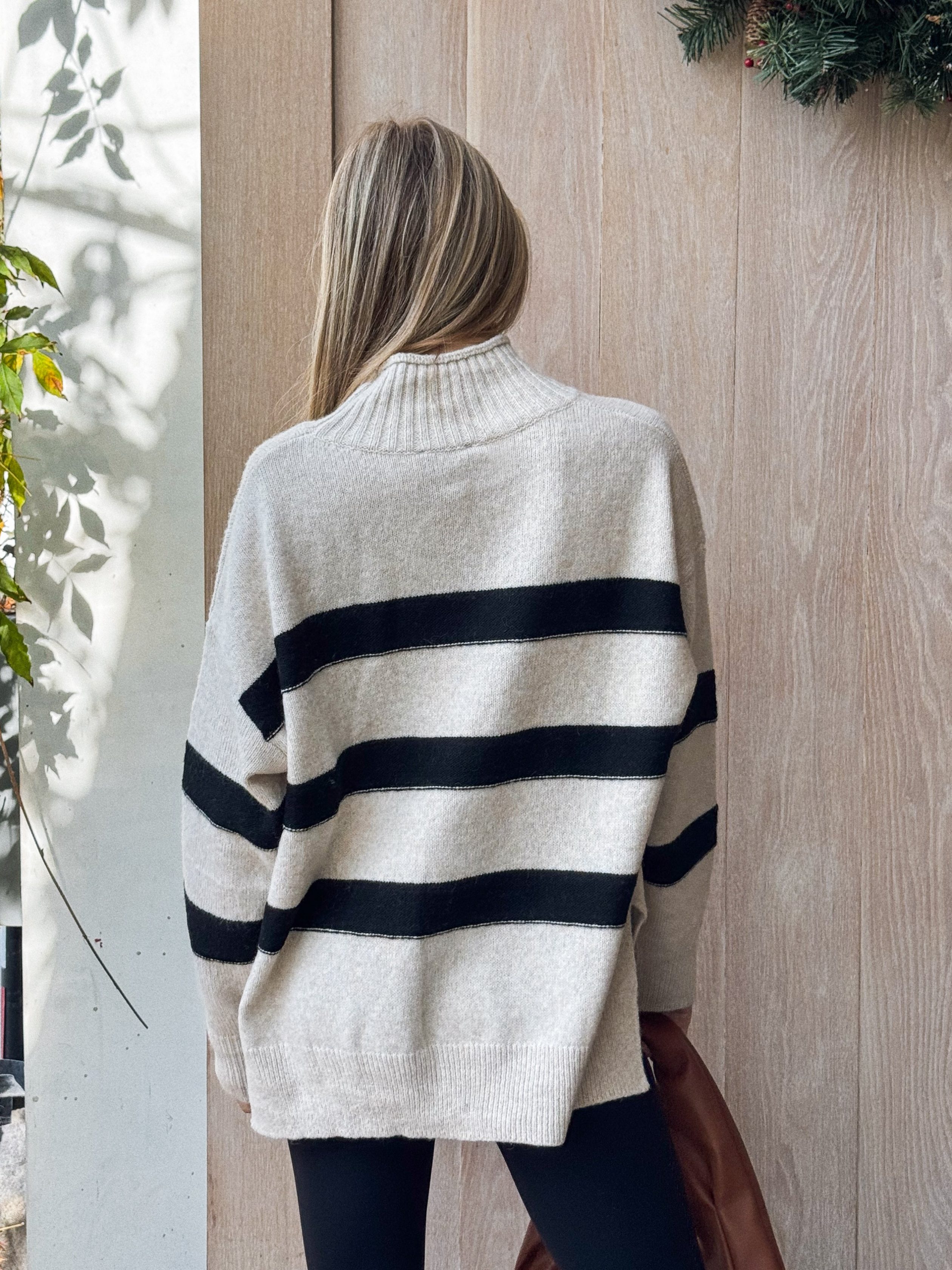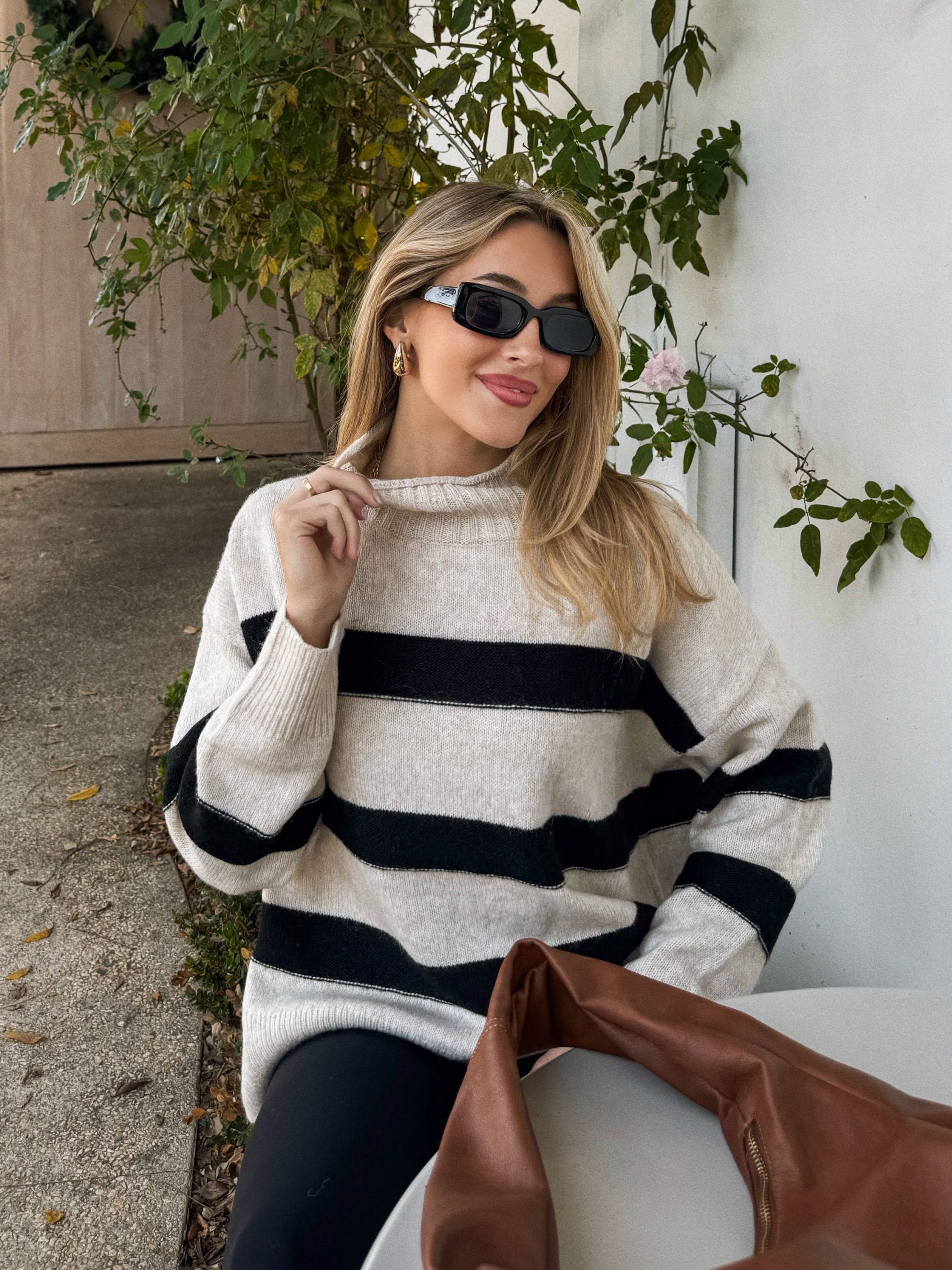 Add this sweater to the winter rotation. Pair our NEW Camille Stripe Knit Sweater with black leggings and black boots for a sleek and casual fit. Accessorize with a leather hobo bag and sunnies for that cool girl look.