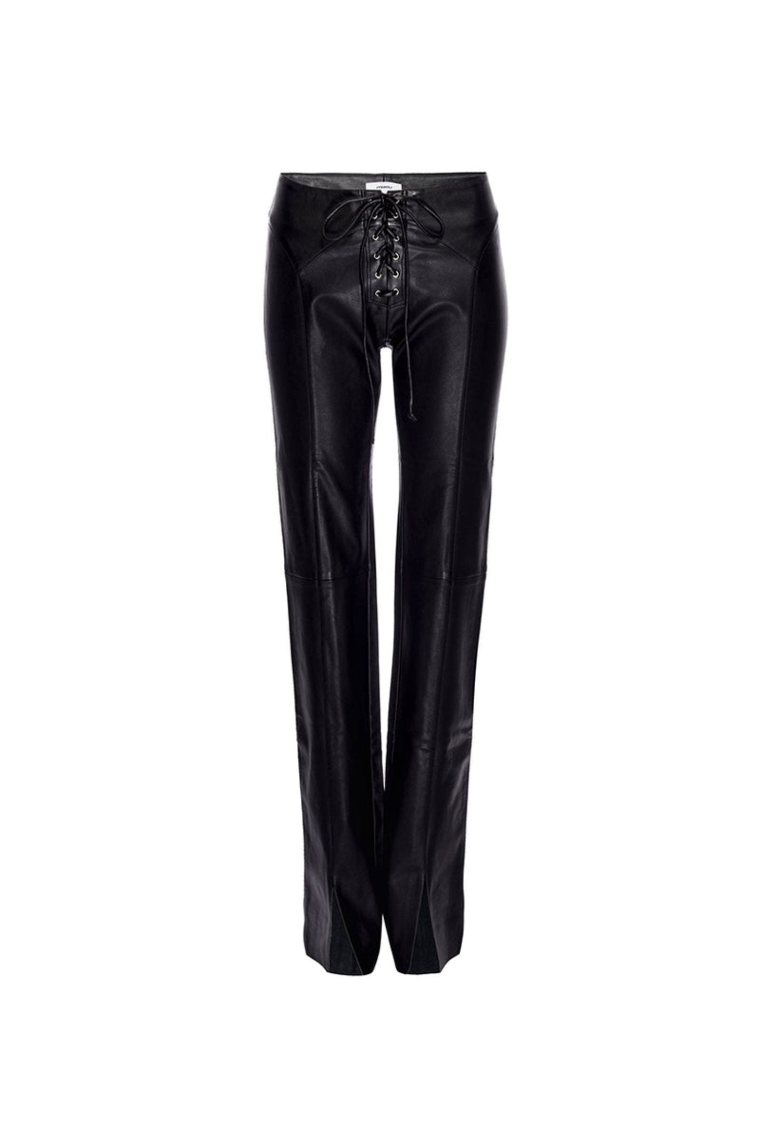 The Element pant in vegan leather features a front lace up closure. slits at each hem. and detailed seams. Pair her with an iconic vegan or real leather Corset. As seen on Rihanna.