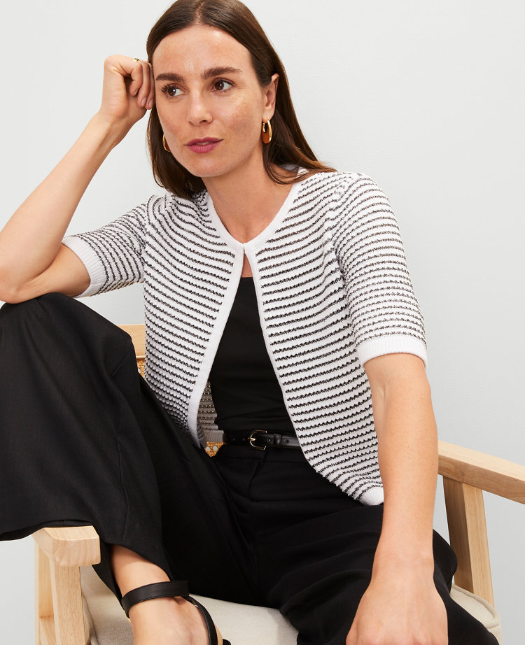 A classic silhouette is given a fresh update, thanks to pretty metallic detailing that effortlessly add a hint of sparkle. Crew neck. Short sleeves. Front hook-and-eye closure. Front welt pockets. Ribbed cuffs and hem.