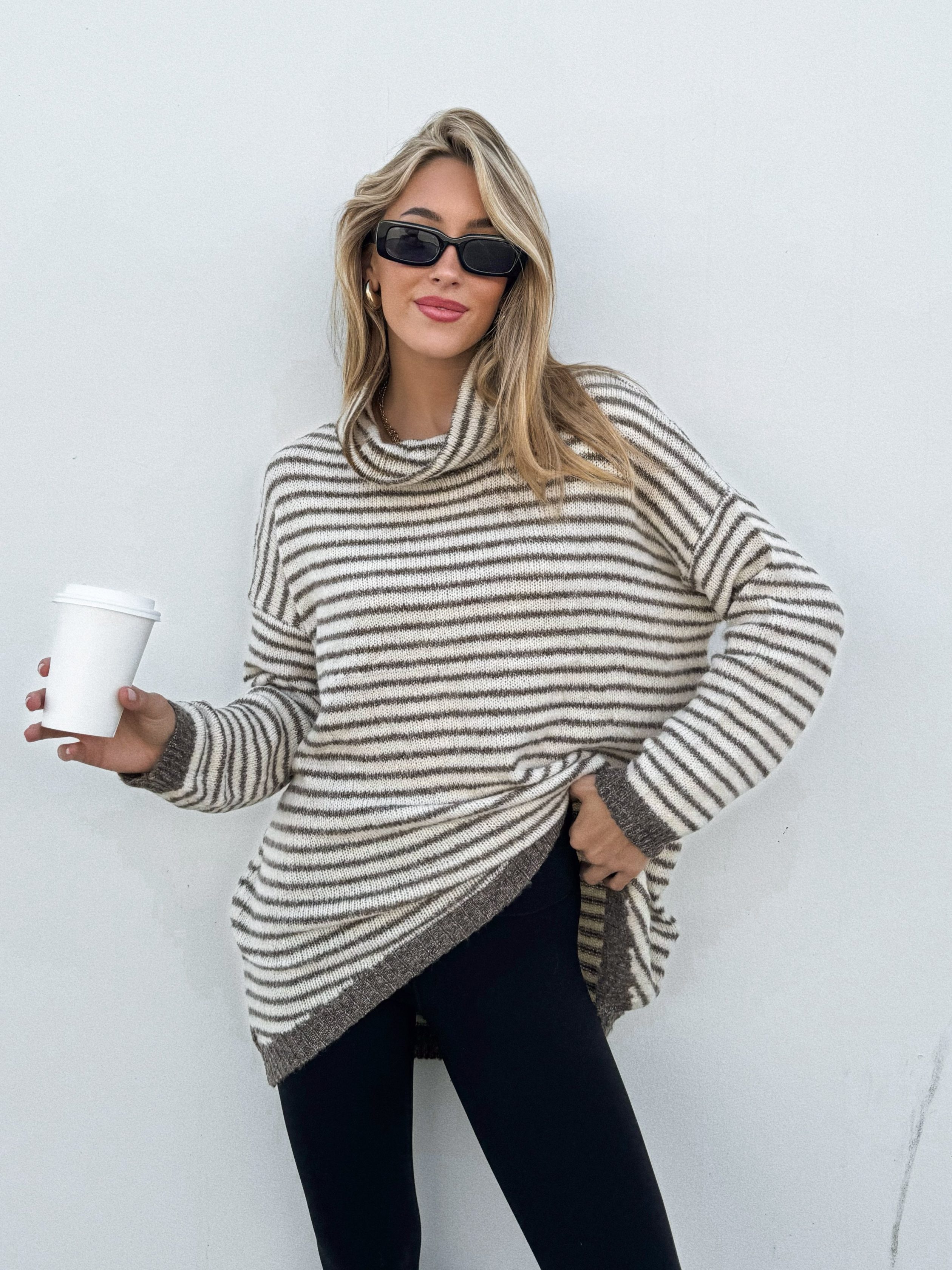 Forget diamonds. stripes are a girl’s best friend. Style our Mocha Stripe Knit Sweater with vegan leather leggings and booties for a chic day to night look.