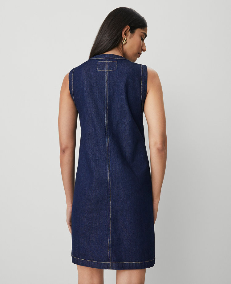 Button patch pockets punctuate this tailored denim shift with mod-chic appeal. Round neck. Front-button closures. Sleeveless. Four front-button patch pockets. Lined.