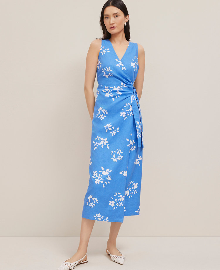With a clever back zip, this dress achieves the impossible elegance of a draped wrap silhouette in one streamlined step. V-neck and V-back. Sleeveless. Side waist ties. Hidden back-zip closure.