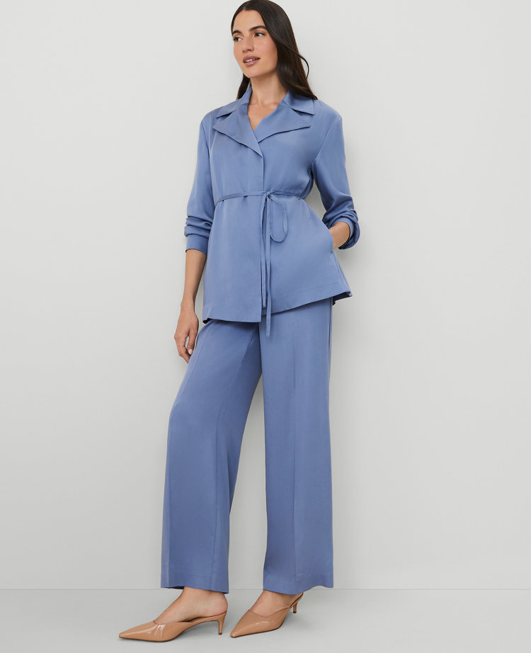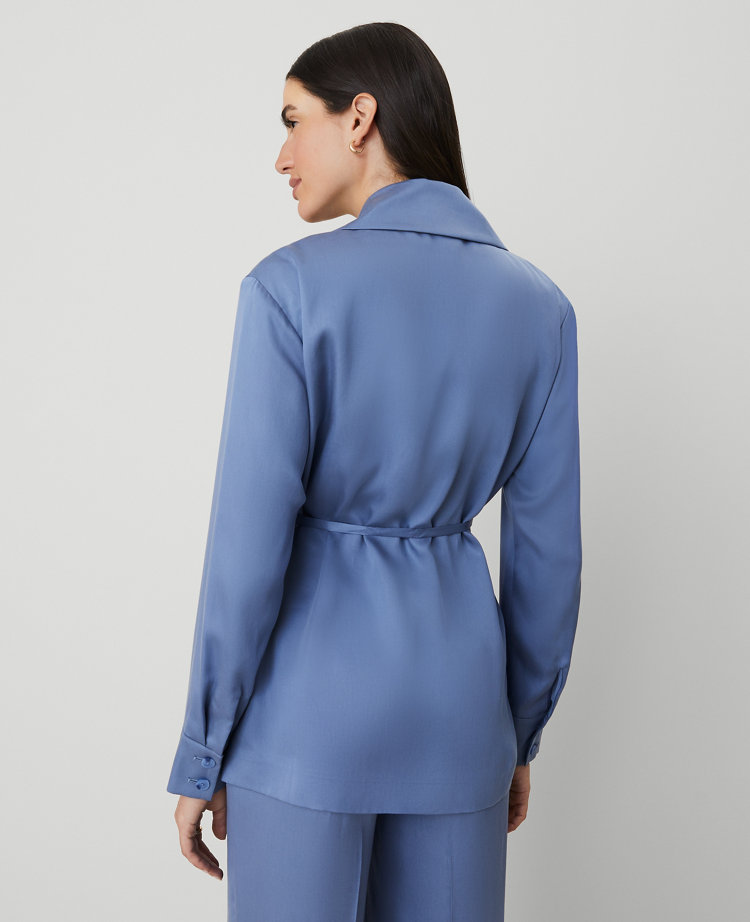 A wrap silhouette in glossy sateen, this blazer imbues weekday tailoring with a hint of glamour. Notched lapels. Open front. Dropped shoulders. Long sleeves with button cuffs. Removable tie belt. Side slit pockets.