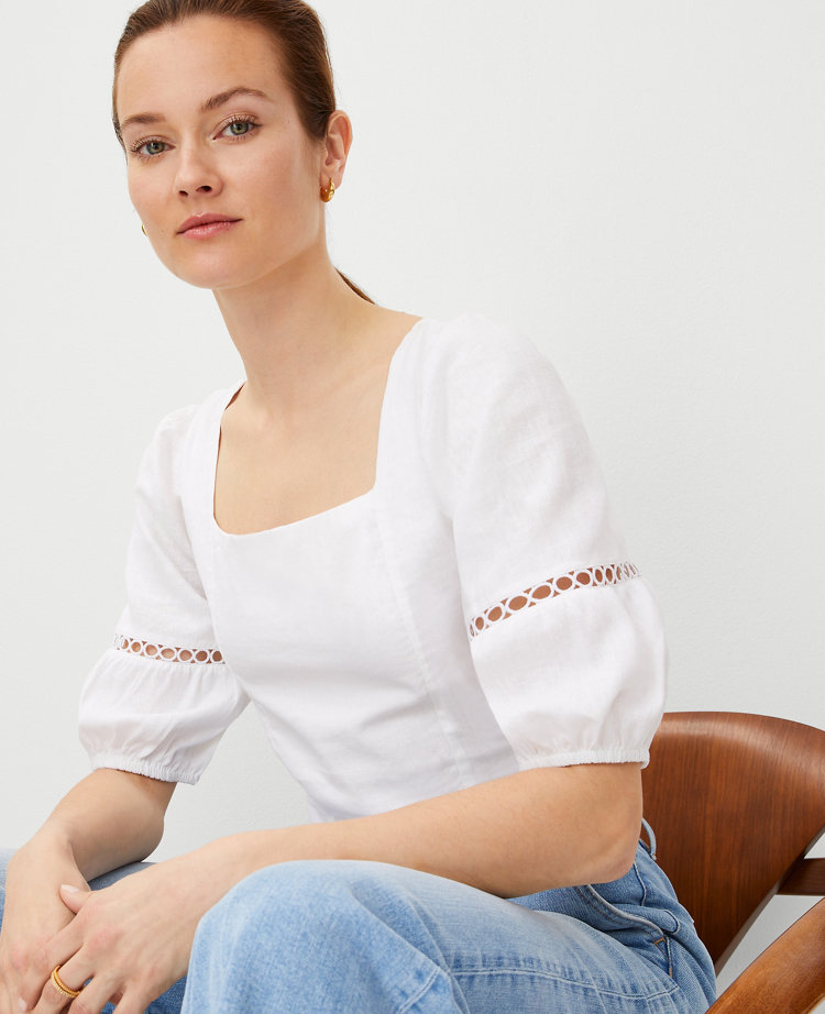 A square neckline paired with pretty puff sleeves equals feminine perfection – in a romantic silhouette. Square neck. Short sleeves with shirred sleeve caps and elasticized cuffs. Smocked back panel. Lined body.