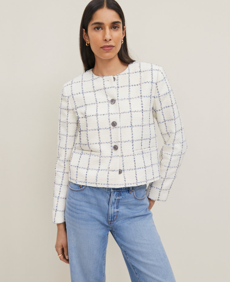 Pull any look together in a stylish instant, courtesy of this beautifully cut tweed jacket. Round neck. Front button closures. Long sleeves. Front welt pockets. Lined.