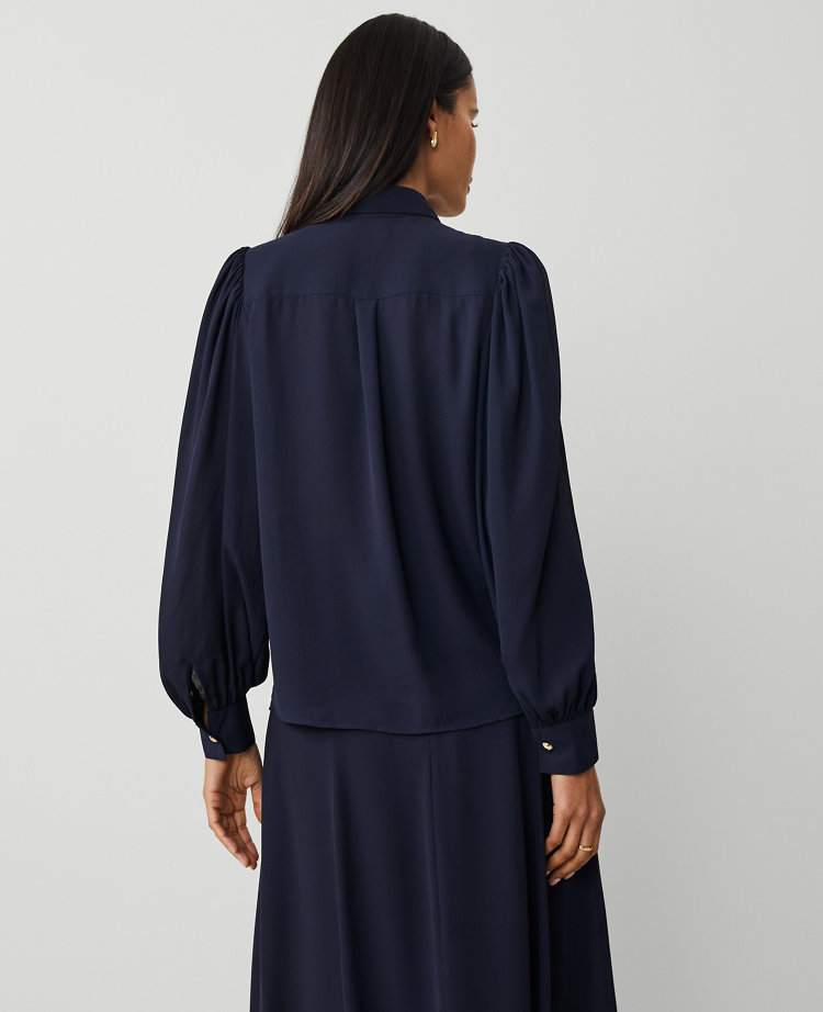 With utility-inspired pockets, this urbane-yet-easygoing blouse dresses up just a bit with feminine puff sleeves. Point collar. Hidden front button placket. Long blouson sleeves with button cuffs. Front button flap patch pockets. Back yoke with box pleat.