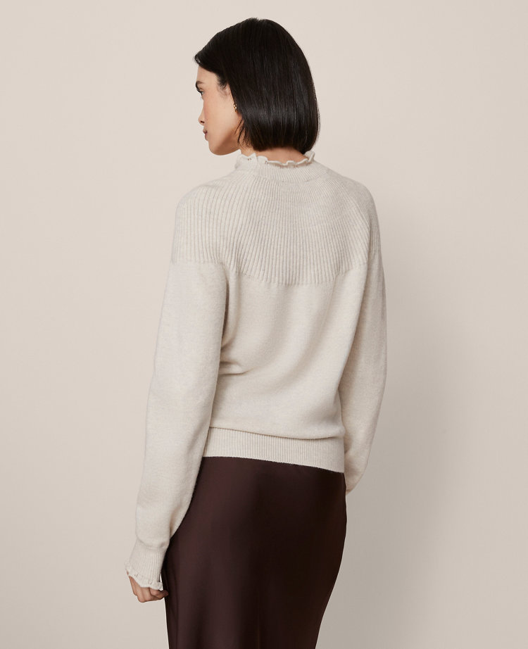 Pretty ruffled edges and slim ties give this sweater the perfect balance of romance and feminine appeal. Ruffle trim mock neck and cuffs. Long sleeves.