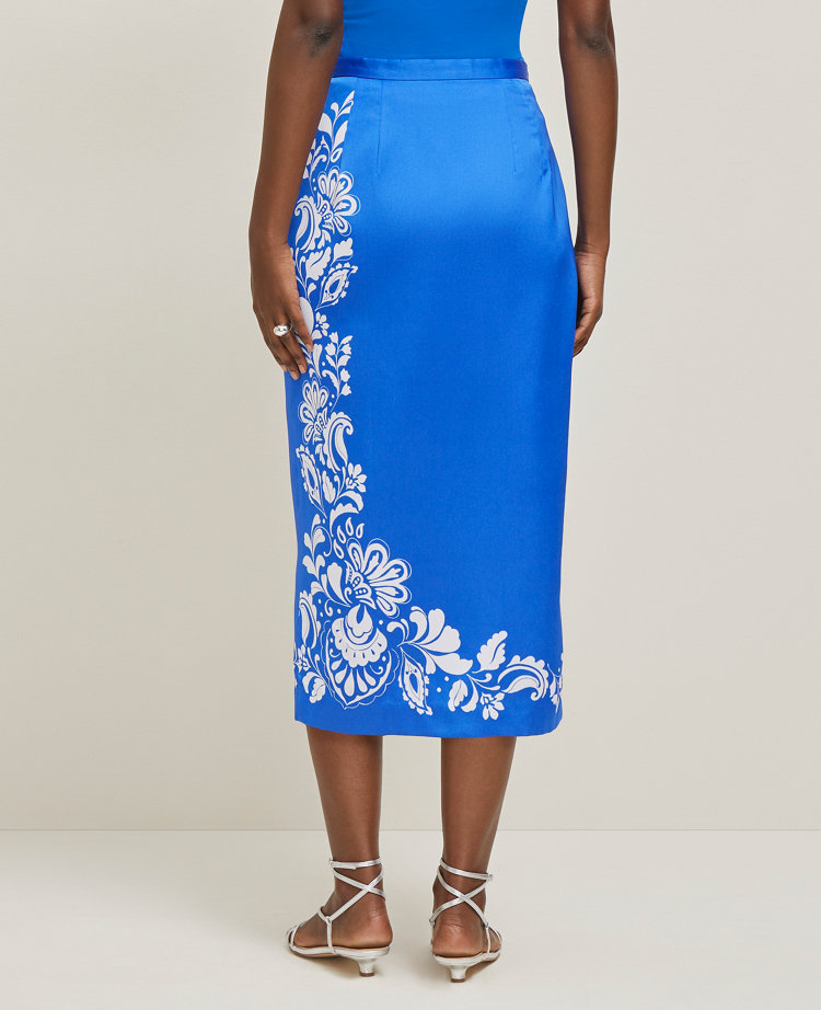 A wrap effect adds a touch of elegant flow to this sleek, streamlined column skirt. Hidden side-zip closure.