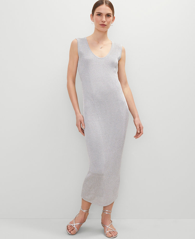 Our metallic sweater dress is made from a ribbed knit and features a pretty hint of shimmer. Scoop neck. Sleeveless.