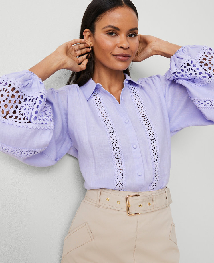 From its shirred shoulders to the embroidered trim, this effortlessly eye-catching linen blouse proves beauty is in the details. Point collar. Front button closures. Drop shoulders. Long blouson sleeves with elasticized cuffs. Shirttail hem.