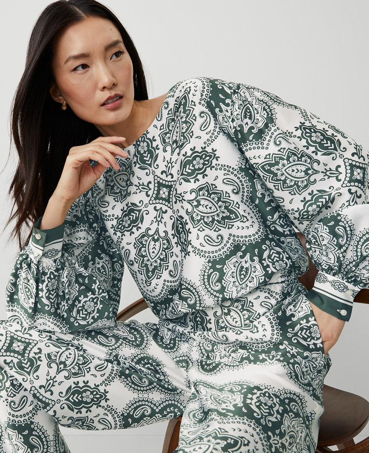 Dropped shoulders, draped blouson sleeves and a bubble hem create a chic, flattering silhouette. Round neck. Long sleeves with button cuffs. Elasticized hem. Back button-and-loop keyhole.
