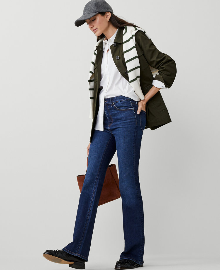 Our mid rise boot cut jeans are designed with sculpting pockets that smooth, flatter and hold their shape. Performance stretch denim sculpts, shapes and supports all day long. Front zip with button closure. Belt loops. Classic five-pocket styling.