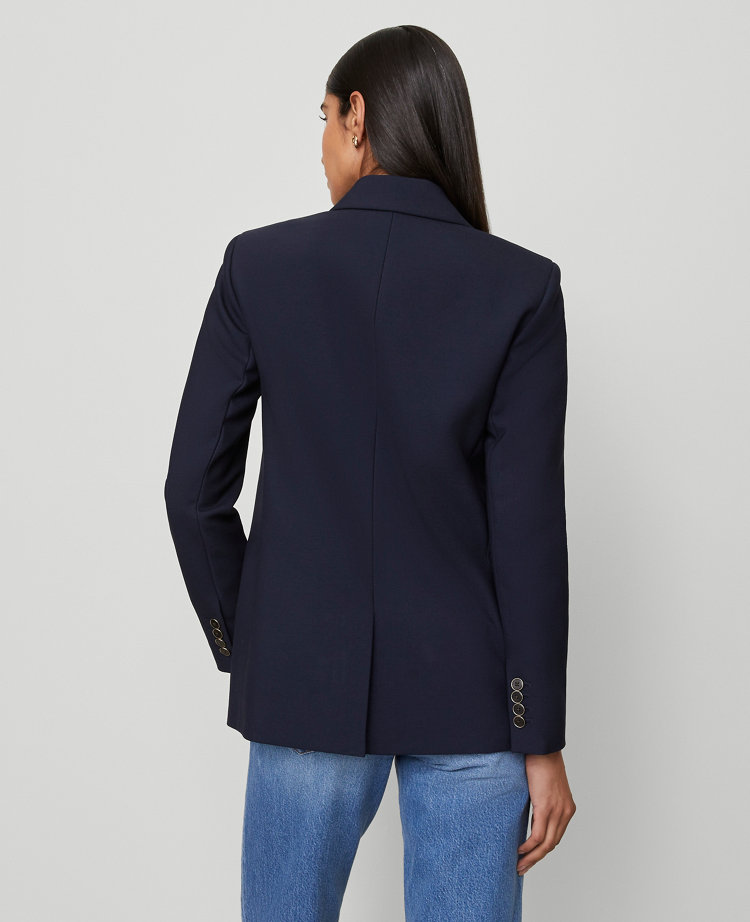 Polished and fresh, this double-breasted blazer works a modern angle on classic tailoring. Peak lapels. Double-breasted button front. Long sleeves with button cuffs. Front flap besom pockets. Lined.