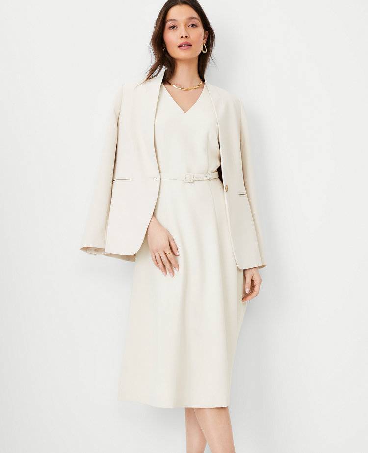 The Petite Belted V-Neck Midi Dress in Fluid Crepe