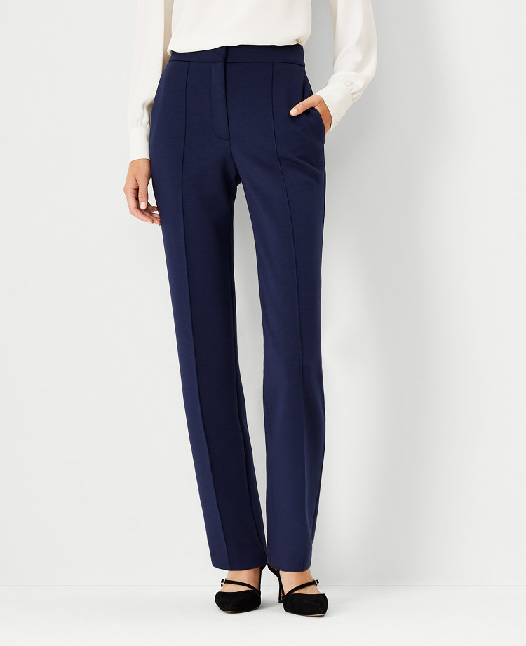 Formerly known as the straight pant, our sophisticated and timeless straight-leg pant has a classic lean fit for a chic, structured silhouette. The stretchy yet sophisticated wrinkle-resistant fabric is comfort-chic at its finest. It also plays very well with others—mix and match the collection with ease. Front zip with double hook-and-bar closure. Front pintucks. Front off-seam pockets. Back besom pockets. Shop all Double Knit Suiting