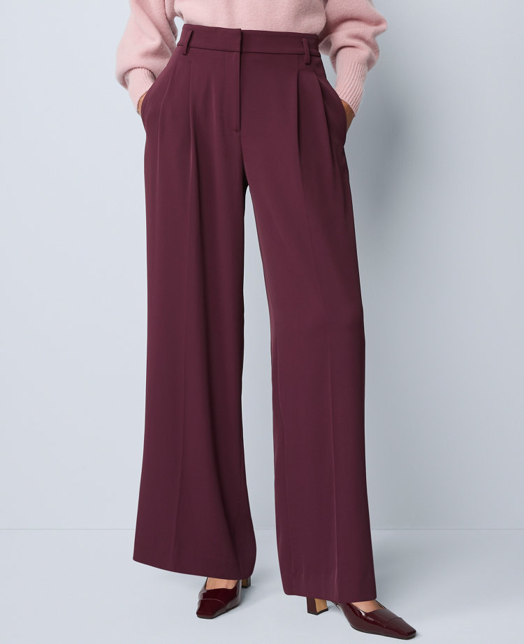 This flattering pant features an easy fit through the thigh and front pleats for extra ease of movement. Front zip with double hook-and-bar closure. Belt loops. Front pleats. Front on-seam pockets. Back besom pockets.