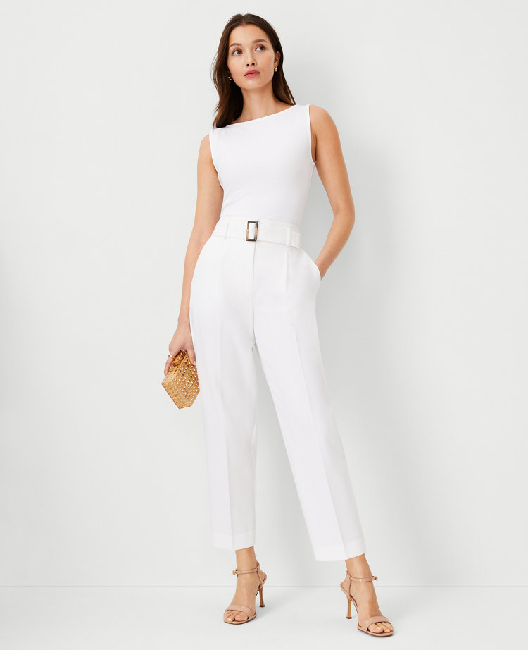 Topped with a flattering belted waist, these tapered pants will keep you on the move. Front zip with double hook-and-bar closure. Belt loops. Self tie buckle belt. Front pleats. Front off-seam pockets. Back besom pockets.