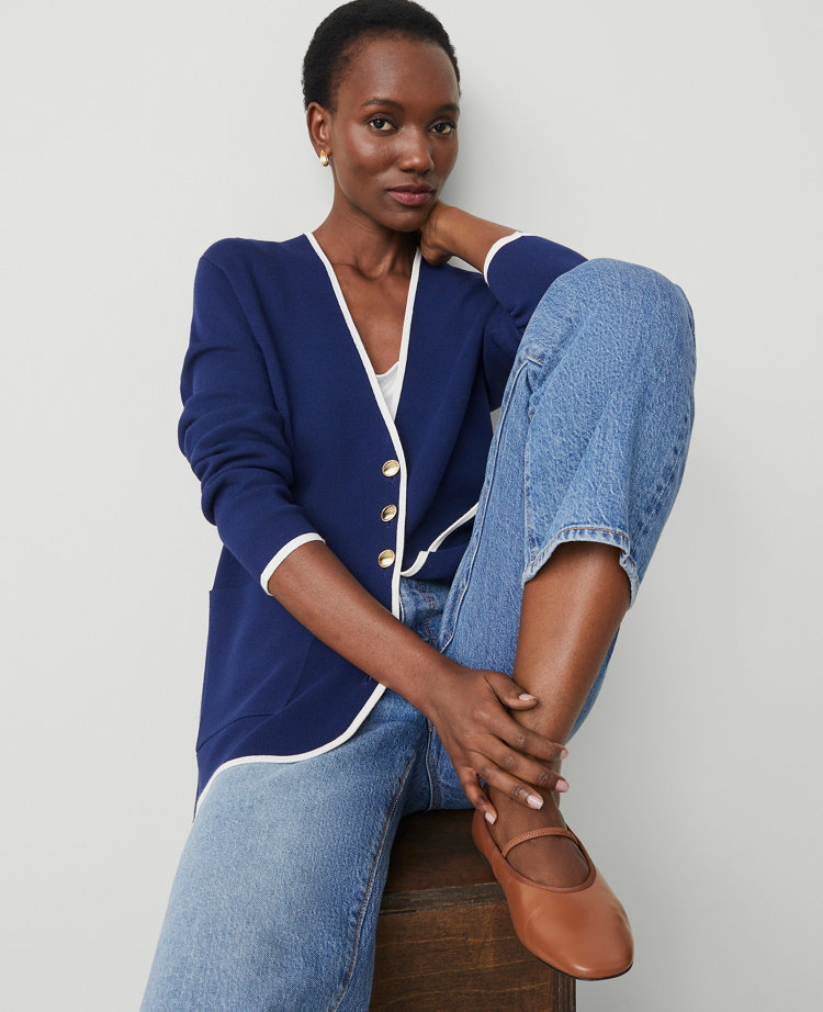 This work-to-weekend essential combines the tailored polish of a blazer with the soft ease of a cardigan. V-neck. Front button closures. Long sleeves. Front patch pockets.